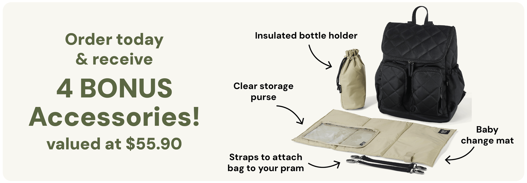 Yes! All our full-sized Nappy Bags come with 4 bonus accessories valued at $55.90: a padded changing mat, an insulated bottle holder, pram straps, and a clear wet purse.