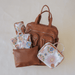 • Carry All Nappy Bag in Tan Vegan Leather – A sleek, spacious design that works as a nappy bag or day-to-day carryall. More info.