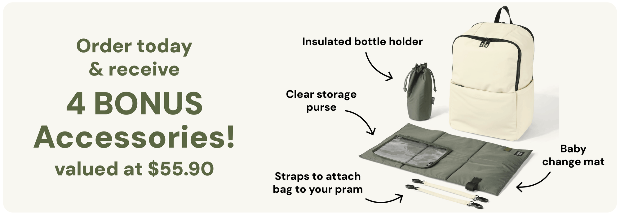 Yes! The Multitasker Nappy Backpack comes with a changing mat, insulated bottle holder, stroller straps and clear purse valued at $55.90.